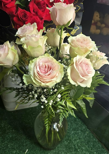 A romantic vase of soft pink roses with lush greenery—perfect for any occasion.