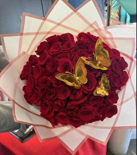 A stunning buchón bouquet crafted with lush red roses and accented with elegant gold butterflies. Full, bold, and beautifully wrapped—perfect for birthdays, anniversaries, or romantic surprises.