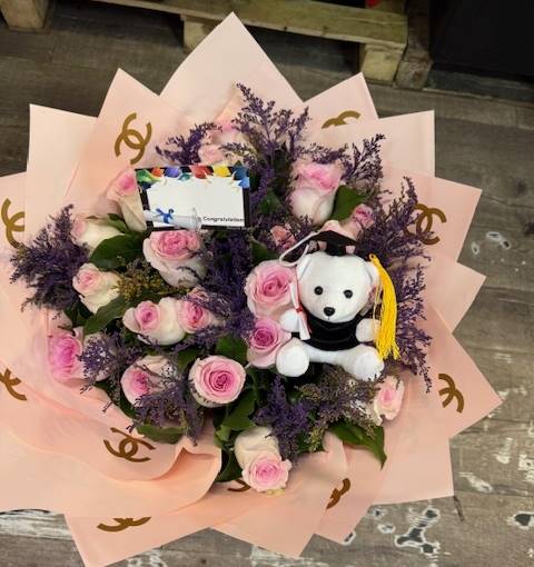A sweet mix of pink roses and purple fillers, beautifully wrapped and paired with a cute graduation teddy. The perfect gift to celebrate your grad’s big achievement.