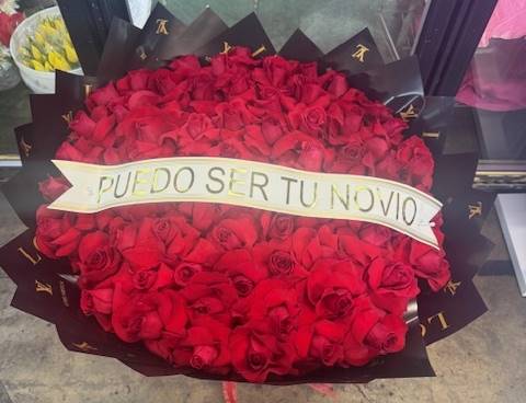 This stunning buchón arrangement features premium red roses and a sweet “¿Puedo ser tu novio?” message. A dramatic and unforgettable way to ask someone special.