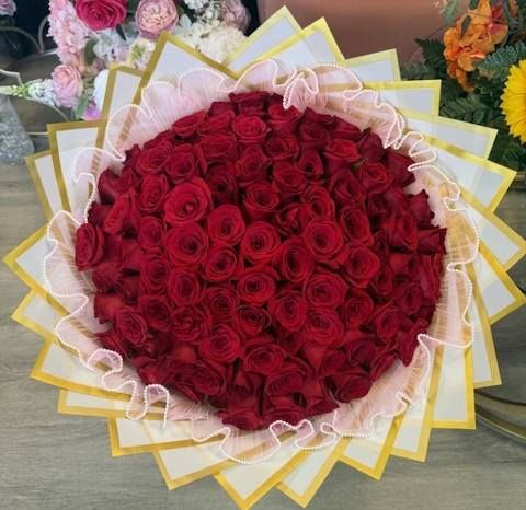 A stunning buchón bouquet filled with premium deep-red roses and wrapped in elegant gold and white accents. Timeless, romantic, and perfect for any special occasion.