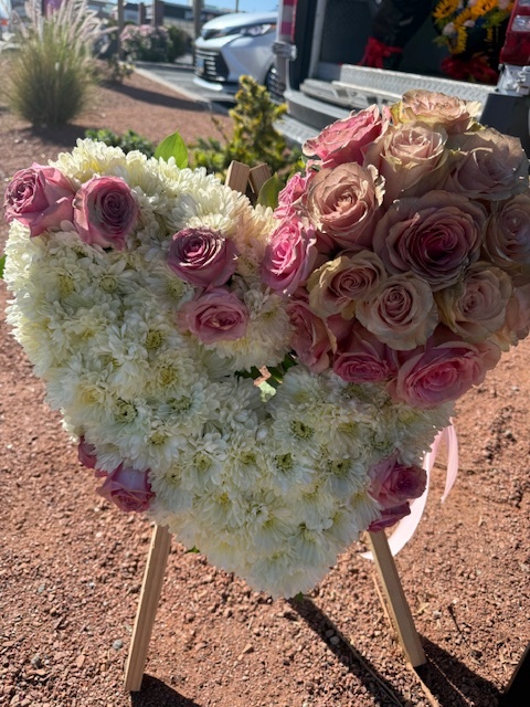 Heart-shaped sympathy arrangement with white mums and pink roses. A beautiful, elegant tribute for funerals, memorials, and celebration-of-life ceremonies.