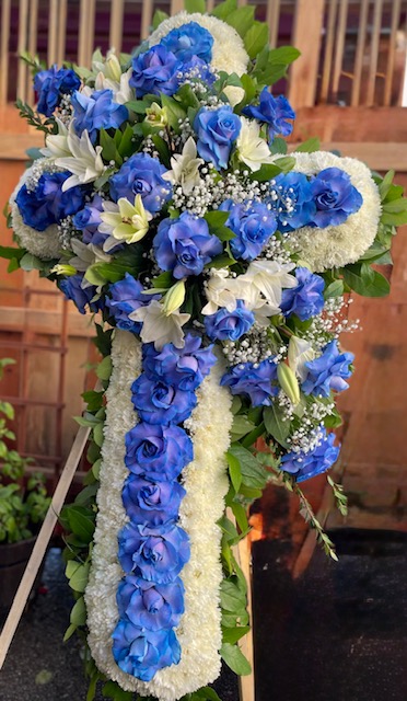A stunning blue and white funeral cross with roses and lilies—crafted to express faith, love, and eternal remembrance.